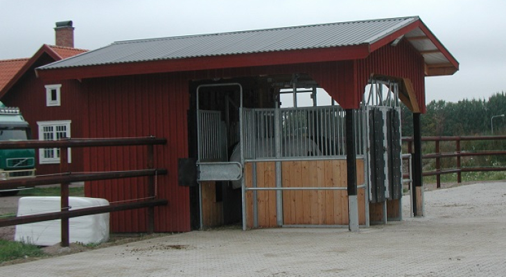 Kuva 2. Havaintopiirros tutkimuksen karkearehuautomaatista. Automaattiin mahtuu kaksi hevosta kerrallaan. (Morgan, K.)