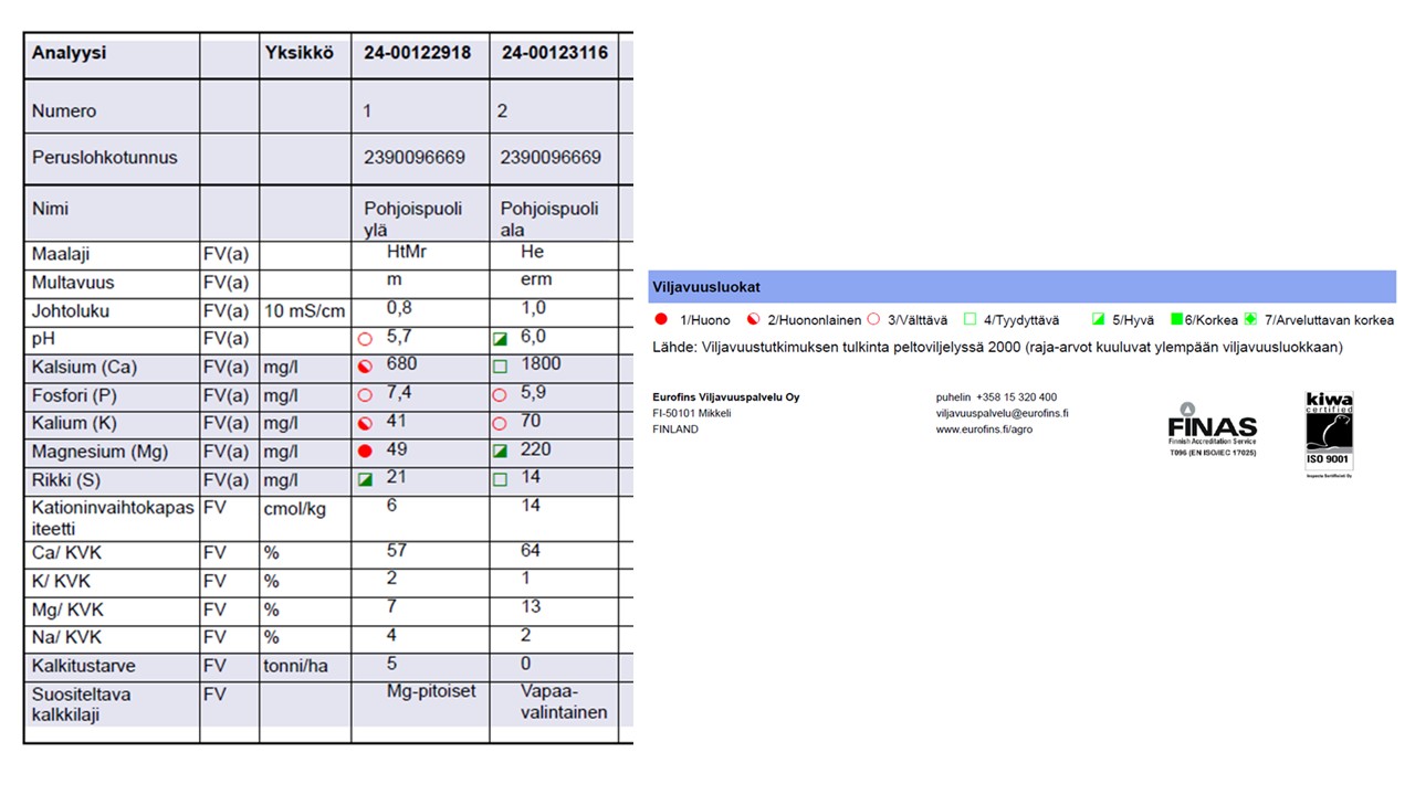 Maan lannoitustarvetta arvioitaessa voidaan käyttää hyväksi maan ravinnemääristä kertovia analyysituloksia. Esimerkissä kummankin maanäytteen viljavuusluokka on fosforin (P) osalta välttävä ja kaliumin (K) osalta välttävä tai huononlainen. Hietamoreenia sisältävä viljelyalan (näytenumero 1) viljavuusluokka on maan happamuuden eli pH:n osalta välttävä, kalsiumin (Ca) osalta huononlainen ja magnesiumin (Mg) osalta huono. Kyseiselle viljelyalalle (näytenumero 1) on suositeltu magnesiumia sisältävän kalkin levitystä tilanteen korjaamiseksi.