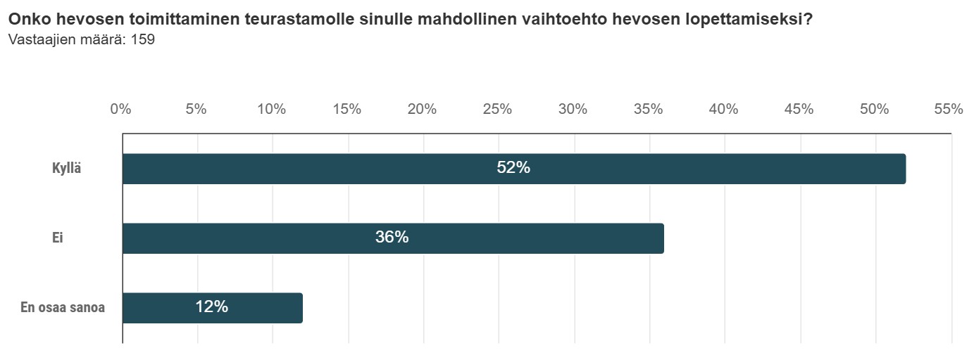 Yli puolet vastaajista ilmoitti, että hevosen toimittaminen teurastamolle on heille mahdollinen vaihtoehto hevosen lopettamiseksi (kuva 2.). Vastaajista 41 % oli tähän mennessä toimittanut oman hevosen teurastamolle. Näistä neljännes oli toimittanut 1-5 hevosta teurastamoon viimeisen vuoden aikana. Syitä hevosen toimittamiseksi teurastamoon olivat hevosen sairaus tai vamma (55/65), hevosta ei haluta laittaa “kiertoon” (31/65), hevosen korkea ikä (15/65), hevosen käytösongelma (8/65) ja hevosen soveltumattomuus sen käyttötarkoitukseen (8/65).