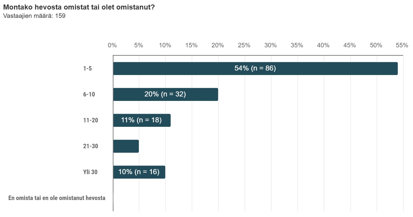 Kyselyyn saatiin 159 vastausta. Vastaajista hevosharrastajia oli 65 % ja talliyrittäjiä 24 % ja “jokin muu” vaihtoehdon oli valinnut 11 %. Yli puolella vastanneista oli kokemusta 1-5 hevosen omistamisesta (kuva 1). Vastaajista suurimmalla osalla (83 %) oli ollut hevosia vähintään 11 vuotta. Enintään viisi vuotta hevosia oli ollut 7 % vastanneista. Lähes kaikki vastaajat tiesivät (155/159), milloin hevosen passiin tehdään merkintä hevosen teuraskiellosta.