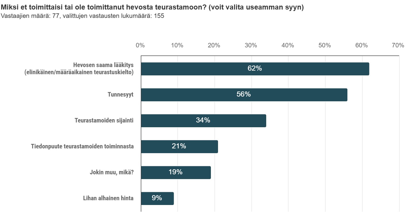Hevosten viemistä teurastamoille rajoittivat tiedon puute toimijoista ja teurastamoiden käytännöistä, luottamuksen puute, heikko lihan hinta ja teurastamoiden kaukainen sijainti. Osassa vastauksista kritisoitiin tiettyjen lääkeaineiden käyttöön liittyvää elinikäistä teurastuskieltoa.