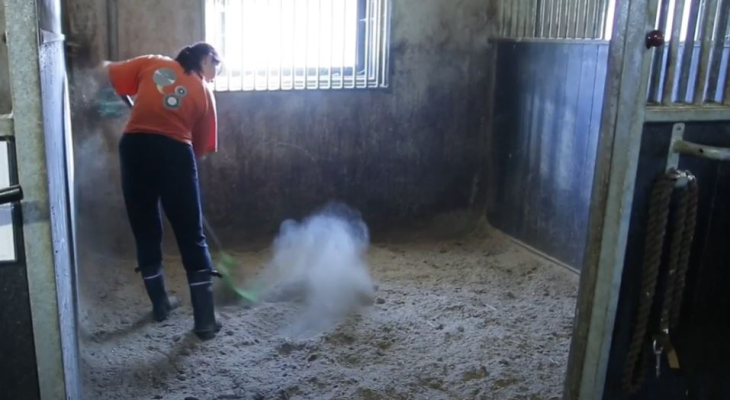 Kuivikkeiden käsittely ja karsinan siivous nostattavat pölyä talli-ilmassa, olipa kuivikemateriaali mikä hyvänsä. Video sisältää Hevostietokeskuksen tutkimuksiin perustuvaa tietoa kuivikkeiden hygieenisestä laadusta.